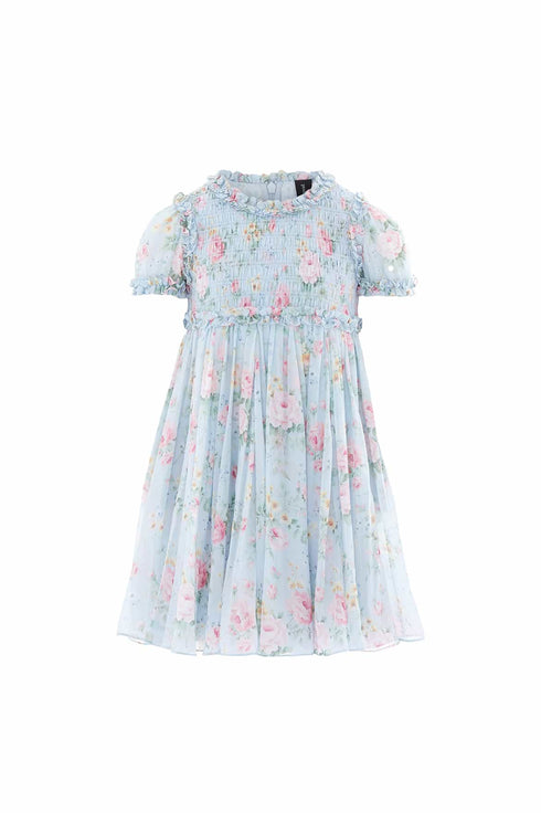 The Pompadour Garden Giselle Chiffon Kids Dress in French Blue. Inspired by the opulent wall coverings of the Palace of Versailles, this dress features hand-painted floral bouquets and ditsy motifs. Crafted from soft chiffon, the shirred bodice is adorned with signature Needle & Thread frills at the neckline, shoulders, and waist. Short puff sleeves with gathered details and a ruffled cuff, paired with a delicately gathered skirt, make this dress perfect for twirling.