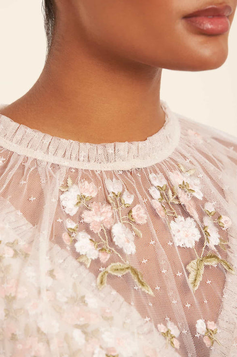 The Posy Midaxi Open Cape in Cream. This cape is adorned beautifully with clusters of intricate floral bouquets and shimmering sequins for a sparkling effect. This tulle cape is designed to style over the Posy Cami Gown and features a shaped edge at the front to reveal subtle gown detailing. The perfect styling piece.
