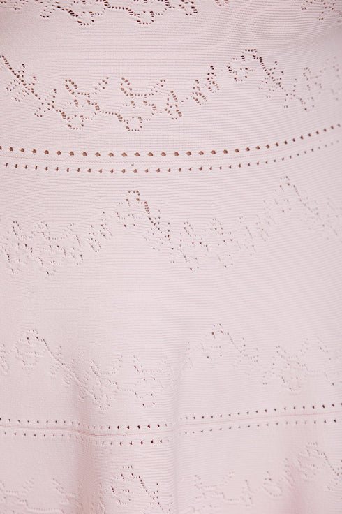 The Pretty Pointelle Knit Scoop Neck Mini Dress in Pink. A brand new style for Needle & Thread. This knitted dress is inspired by vintage ditsy florals and lace. Beautifully designed with all-over pretty pointelle stitch, delicate florals and scallop details. This dress has a fitted stretch bodice with a soft, feminine neckline, fluted cuffs and signature Needle & Thread detailing. A truly flattering piece.