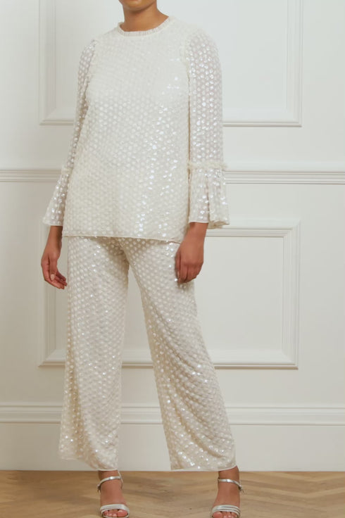 The Raindrop Gloss Tunic in Cream. This top is beautifully adorned with scattered sequins, adding a romantic, shimmering effect. Designed with the most exquisite sequins with an extra foil coating to create an ultra-high shine finish. This relaxed tunic is designed with an easy-wear, loose fit silhouette. Developed with exaggerated cuff details and voluminous, gathered frill for signature Needle & Thread details. Pair with the matching Raindrop Gloss Skirt for the full Needle & Thread look.