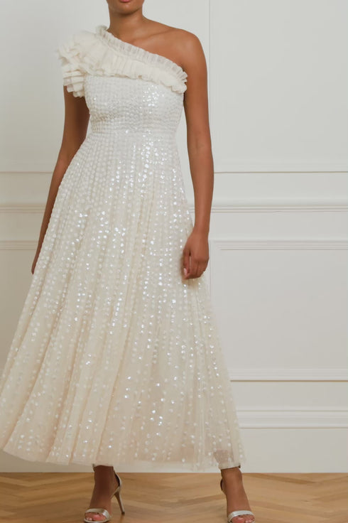 The Raindrop One Shoulder Ankle Gown in Cream / Cream. This gown is beautifully adorned with an enchanting sequin artwork. The artwork is designed with delicate shimmering polka dot sequins in a linear formation capturing the essence of glistening raindrops. Designed with an off-the-shoulder style for elegant detailing. The skirt is made from layers of frothy tulle featuring statement frill details, creating a signature romantic look. The gown is perfect for an upcoming special event.