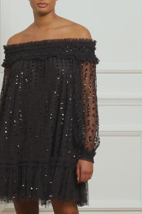 The Raindrop Smocked Gloss Off-Shoulder Micro Mini Dress in Graphite. Beautifully decorated with shimmering sequins dispersing down the body. This dress is developed with an off-the-shoulder design with signature Needle & Thread frills for an elegant look. This romantic style is crafted with a loose-fit, whimsical silhouette featuring a delicate fabric belt for versatile styling. A piece you'll forever treasure.
