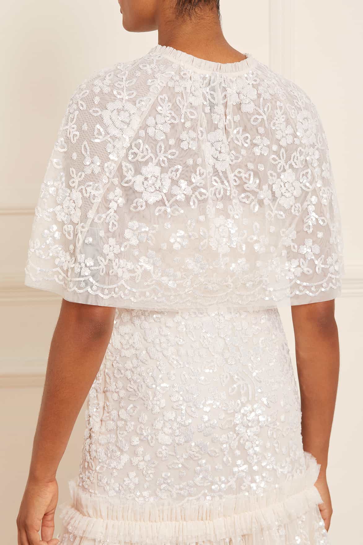 The Regal Rose Gloss Short Open Cape in Cream. This cape is decorated with an elegant, floral artwork featuring delicate lace. Beautifully designed to sit over our Regal Rose Gloss Strapless Gown. Designed with a front opening purposely shaped to reveal the dress details. This cape can be used as a styling piece or to layer over the matching gown.