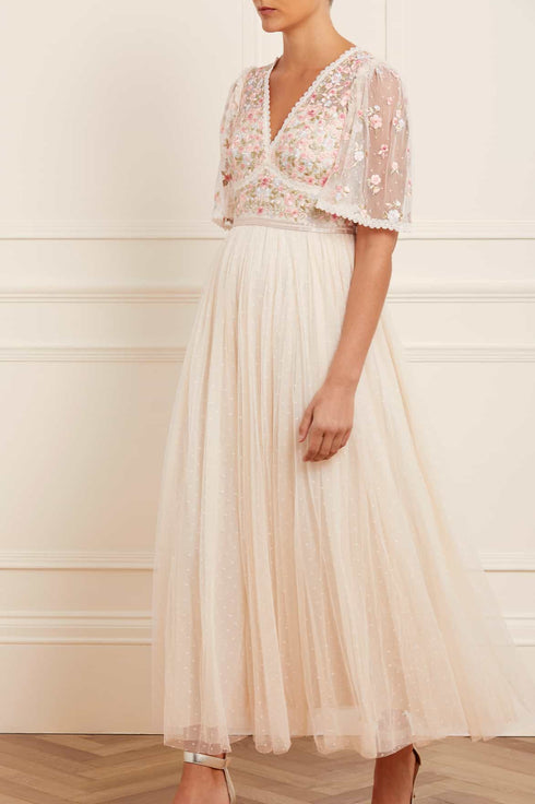 The Ribbon Bouquet Bodice Ankle Gown in Champagne / Pink Multi. The bodice of this gown is intricately designed with embroidered bouquets of flowers in rich tones, inspired by a 1930s vintage print. Beautifully adorned with delicate lace trims for signature Needle & Thread detailing. The skirt features layers of tulle to create a romantic silhouette. The perfect gown for an upcoming occasion.