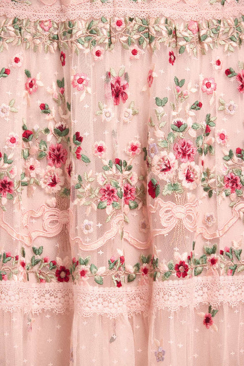 NEEDLE & THREAD EXCLUSIVE. The Ribbon Bouquet Gown in Petal Pink. This gown is intricately designed with embroidered bouquets of flowers in rich tones, inspired by a 1930s vintage print. Beautifully adorned with delicate lace trims for signature Needle & Thread detailing. The skirt is developed with layers of tulle to create a romantic silhouette. The perfect gown for an upcoming occasion.