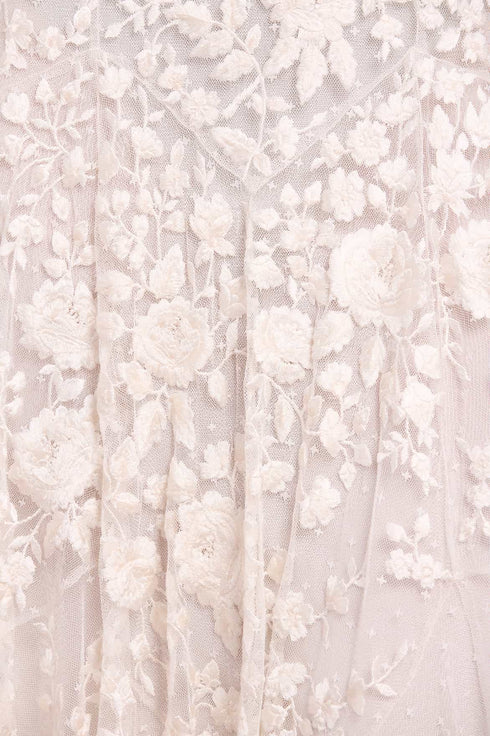 NEW SEASON. The Rosa Round Neck Ankle Gown in Swan White/Cream. Inspired by romantic garden florals, this elegant gown features delicate Rosa embroidery arranged across a softly flowing silhouette. Designed with a round neckline and ankle-length skirt for timeless, refined occasionwear.