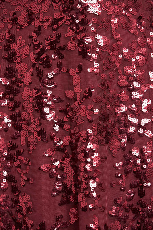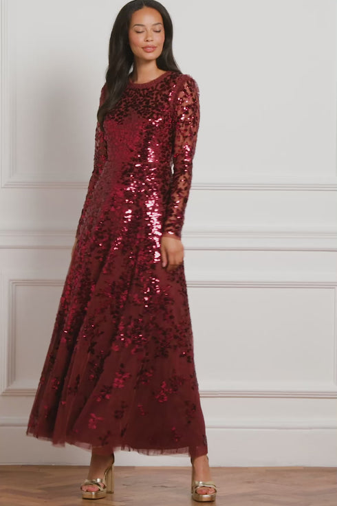 NEW SEASON. The Rosanna Lattice Round Neck Gown in Winterberry. Romantic and striking, this gown reimagines archival florals for a modern muse. The bodice is embroidered with dense sequin florals that transition into an ornate lattice before softening into scattered sequins toward the hem. Crafted in layers of lightweight tulle, the gown flows with movement. The winterberry palette intensifies its richness, evoking the depth of night skies in the Bright Star story.