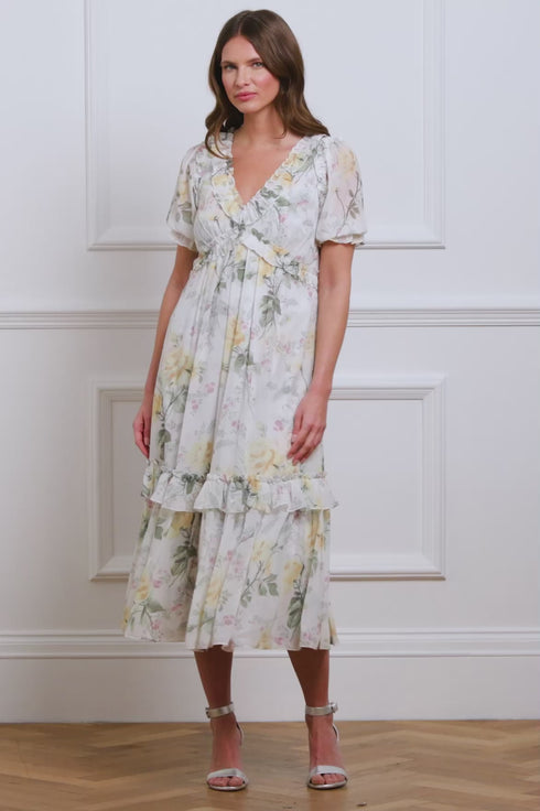 The Rose Chiffon Short Sleeve Ballerina Dress in Moonshine/Yellow features a romantic print inspired by antique hand-painted artwork, with large rose blooms and trailing florals. Made from soft chiffon, the loose-fitting silhouette offers a floaty, ethereal look. Designed with puff sleeves with gathered frill cuffs, a ruffled skirt tier, and chiffon ruffles at the neckline and under-bust seam complete the enchanting design The perfect dress to pack for your holiday.