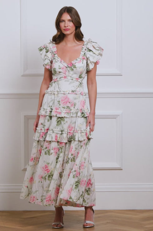 The Rose Cotton Backless Ankle Gown in Moonshine/Pink features a romantic print inspired by antique hand-painted artwork, with large rose blooms and trailing florals. Designed with a flattering open back and a button closure at the neck, this gown effortlessly transitions from day to night.