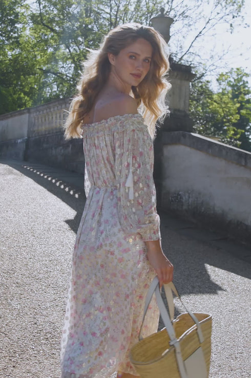 The Rose Ditsy Lurex Midaxi Dress in Moonshine/Pink. This dress features a romantic floral print inspired by 1800s hand-painted wallpaper, with a subtle leopard print on glittering gold lurex georgette. The off-the-shoulder shirred neckline is edged with signature frills, while braided silk tassels adorn the shoulder ties. Developed with blouson sleeves with ruffle cuffs add a romantic touch. The loose fit offers comfort, and a slim self-fabric tie at the waist allows for styling versatility.