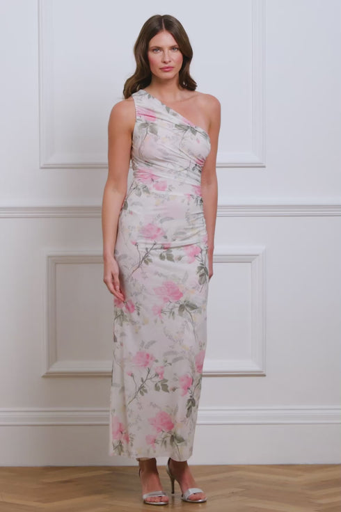The Rose Draped One-Shoulder Ankle Gown in Moonshine/Pink features a romantic print inspired by antique hand-painted artwork with large rose blooms and trailing florals. Crafted from stretch power mesh, this elegant one-shoulder gown has soft ruching for a flattering silhouette, offering both comfort and style. The perfect choice for an upcoming holiday.