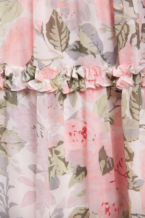 The Rose Powder Chiffon Ankle Gown in Moonshine. This gown is inspired by a 1900s hand-painted wallpaper design. Beautifully printed with florals in faded pastels for a vintage look. Developed with a soft chiffon fabric with a loose fitting silhouette for effortless styling. Designed with an upwards V-shaped waistline to create a flattering fit, gathered ruffles and skirt tiers for a signature Needle & Thread look. A versatile piece you'll forever cherish.
