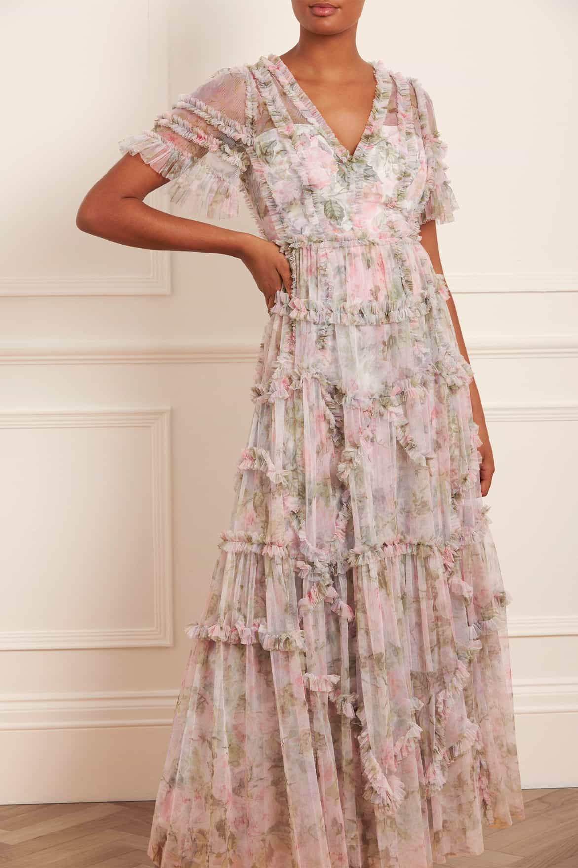 The Rose Powder Ruffle Gown in Moonshine. This gown is inspired by a 1900s hand-painted wallpaper design. Beautifully printed with florals in faded pastels for a vintage look. This gown is crafted with signature Needle & Thread styling featuring tulle ruffles and layers of delicate tulle, creating pretty, effortless movement. A wardrobe treasure you'll forever hold onto.