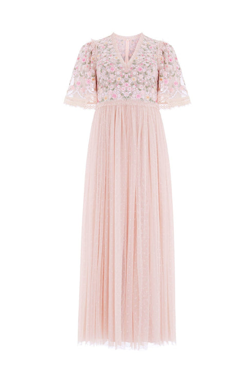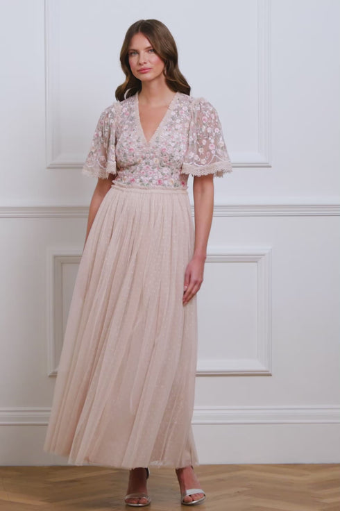 The Rosie Lace Bodice Short Sleeve V-Neck Ankle Gown in Pearl Pink/Multi features an intricately embroidered floral bodice, inspired by a 1930s vintage print. Beautifully designed with delicate lace-trimmed fluted sleeves and soft tulle ruffles at the waist and neckline add romantic detail. The layered tulle skirt creates an ethereal, graceful silhouette, making this gown perfect for any special occasion.