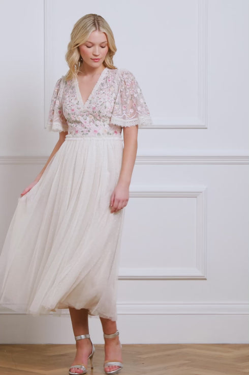 The Rosie Lace Bodice Short Sleeve V-Neck Ankle Gown in Cream/Multi features an intricately embroidered floral bodice, inspired by a 1930s vintage print. Beautifully designed with delicate lace-trimmed fluted sleeves and soft tulle ruffles at the waist and neckline add romantic detail. The layered tulle skirt creates an ethereal, graceful silhouette, making this gown perfect for any special occasion.