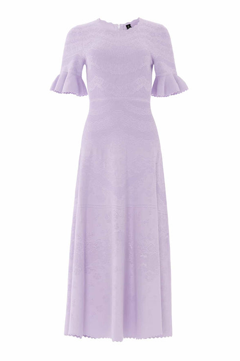 NEW SEASON. The Scallop Lace Pointelle Knit Gown in Powder Lilac. Inspired by classic lace designs, this pointelle knit gown features intricate scalloped detailing throughout. The softly fitted silhouette creates a refined yet comfortable option for occasion dressing.