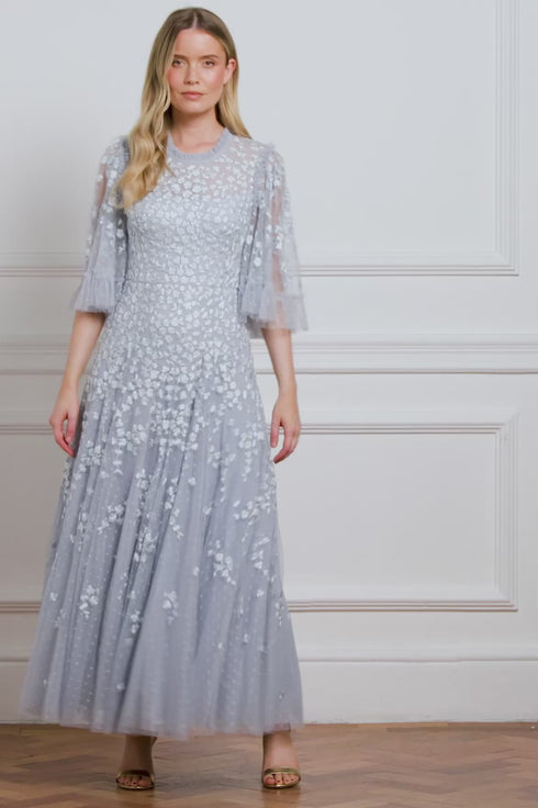NEW SEASON. The Scatter Blossom Round Neck Gown in Skylight. Features whimsical ditsy floral embroidery that fades gently towards the hem. With its round neckline and flowing tulle layers, this gown embodies Needle & Thread’s signature romance.