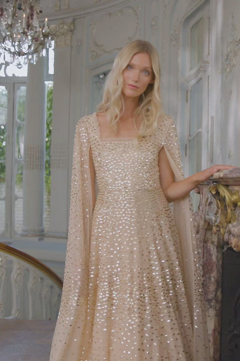 The Scatter Dot Cape Sleeve Ankle Gown in Antique Gold. This embellished gown is decorated with exquisite shimmering dot motifs, undulating in wave formations for a captivating glittering effect. Designed with a sweeping floor-length cape for romantic detailing and a statement look. The flattering square neckline is trimmed with signature Needle & Thread tulle frills. The skirt is made up of generous layers of net and tulle with a sweeping hemline. The perfect choice for an upcoming special occasion and beyond.