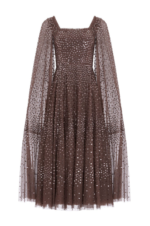 The Scatter Dot Cape Sleeve Ankle Gown in Chocolate. This embellished gown is decorated with exquisite shimmering dot motifs, undulating in wave formations for a captivating glittering effect. Designed with a sweeping floor-length cape for romantic detailing and a statement look. The flattering square neckline is trimmed with signature Needle & Thread tulle frills. The skirt is made up of generous layers of net and tulle with a sweeping hemline. The perfect choice for an upcoming special occasion and beyond.