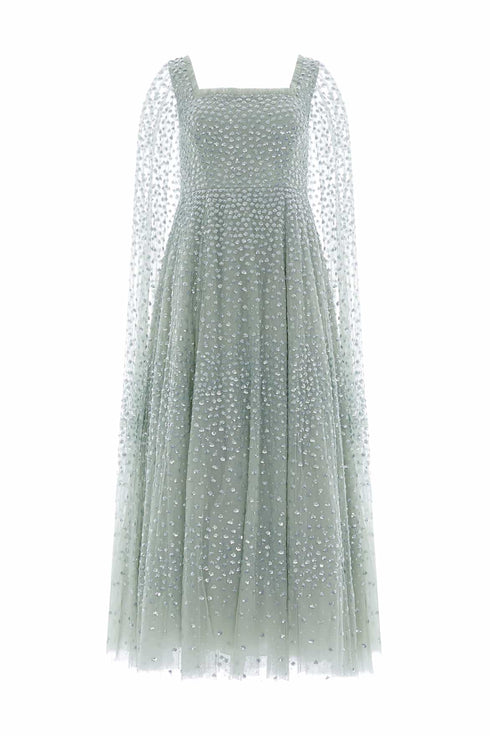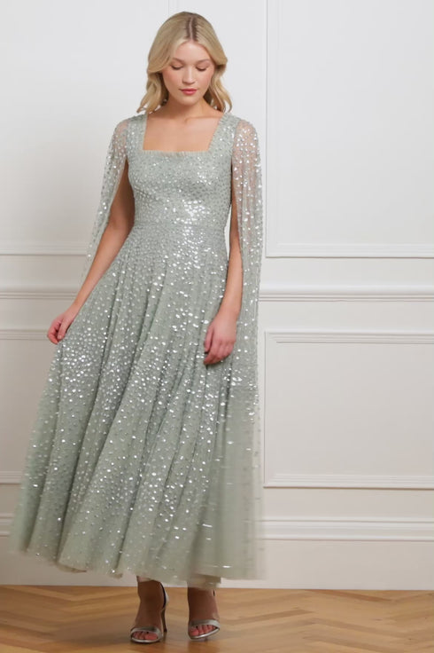The Scatter Dot Cape Sleeve Ankle Gown in Laurel. This embellished gown is decorated with exquisite shimmering dot motifs, undulating in wave formations for a captivating glittering effect. Designed with a sweeping floor-length cape for romantic detailing and a statement look. The flattering square neckline is trimmed with signature Needle & Thread tulle frills. The skirt is made up of generous layers of net and tulle with a sweeping hemline. The perfect choice for an upcoming special occasion and beyond.