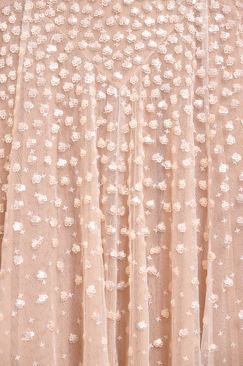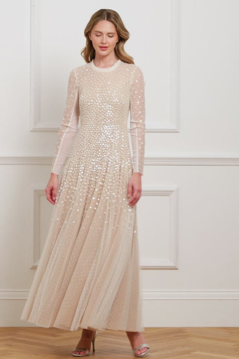 The Sequin Cascade Round Neck Gown in Cream/Butterscotch. This graceful gown is adorned with shimmering sequin dot motifs, crafted with a special high-shine foil coating for a radiant, light-catching finish. Intricate chevron seaming sculpts the hips before flowing into a voluminous skirt of layered net and tulle, creating a soft, sweeping silhouette. Finished with a delicate tulle frill at the round neckline and slim sleeves, the design is lined in a contrast hue for a subtle romantic glow. A beautifully crafted piece for truly special occasions.