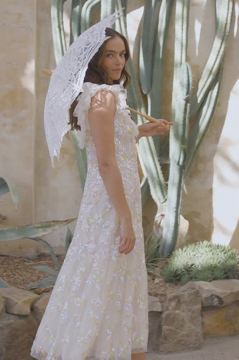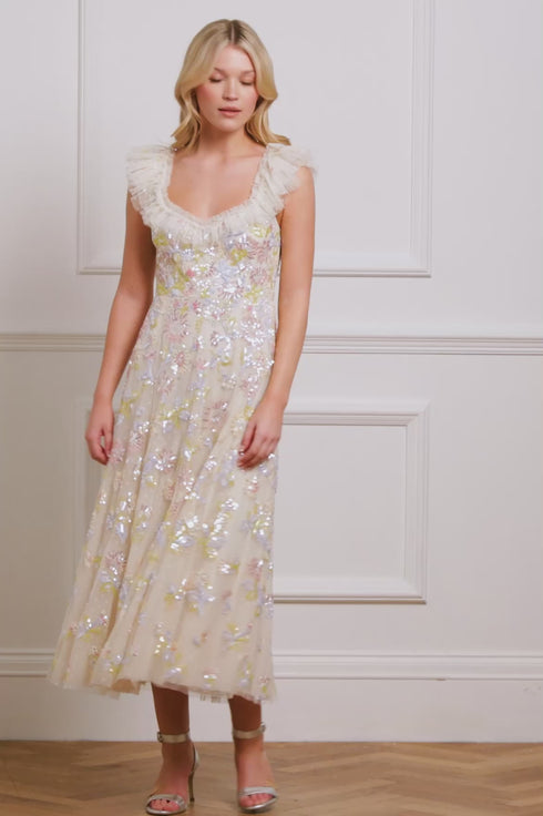The Sequin Dandelion Ruffle Ballerina Dress in Cream, inspired by Victorian botanical artist Marianne North. This dress features colourful shimmering dandelion floral sequins that scatter towards the hem. The high-shine sequins, coated with foil, add a lustrous finish. The flattering skirt skims the body, gently flaring for beautiful movement. Crafted with frothy tulle frill sleeves and signature Needle & Thread frills at the neckline enhance its romantic, elegant feel.