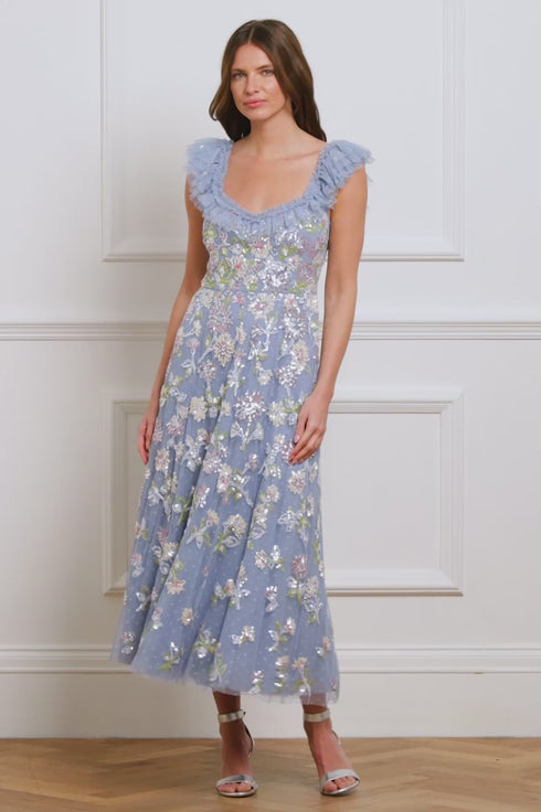 The Sequin Dandelion Ruffle Ballerina Dress in Sky Blue, inspired by Victorian botanical artist Marianne North. This dress features colourful shimmering dandelion floral sequins that scatter towards the hem. The high-shine sequins, coated with foil, add a lustrous finish. The flattering skirt skims the body, gently flaring for beautiful movement. Crafted with frothy tulle frill sleeves and signature Needle & Thread frills at the neckline enhance its romantic, elegant feel.