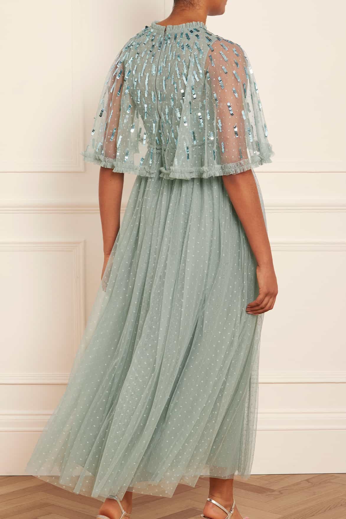 The Sequin Dash Bodice Ankle Gown in Sage. The bodice of this ankle length gown is adorned with statement, square sequins in a staggered linear layout creating a shimmering effect. Developed with a loose silhouette for an effortless, floaty feel featuring voluminous sleeves for a romantic look. The skirt is crafted with layers of net tulle creating movement as you walk. The perfect gown for an upcoming special occasion.