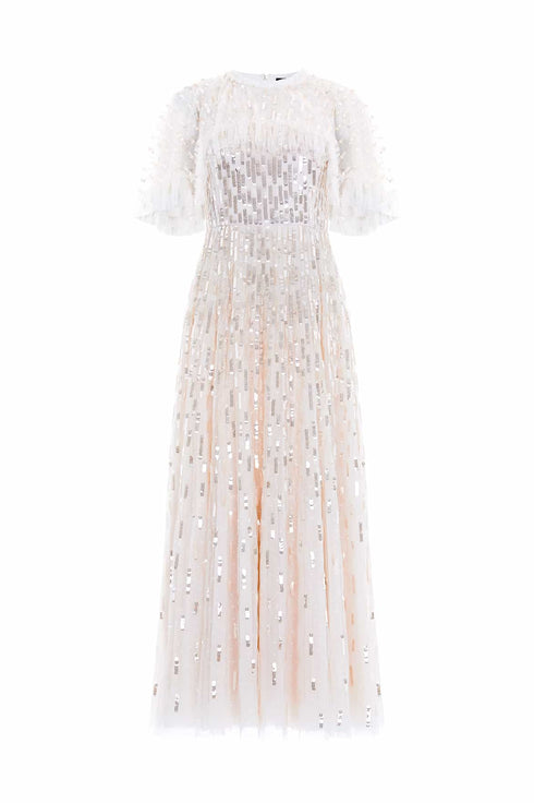 The Sequin Dash Cape Ankle Gown in Cream. This ankle length gown is adorned with statement, square sequins in a staggered linear layout creating a shimmer throughout. Developed with a loose silhouette for an effortless, floaty feel featuring voluminous sleeves for a romantic look. This gown features a layered cape design, which can be removed for versatile styling. The skirt is crafted with layers of net tulle creating movement as you walk. The perfect gown for an upcoming special occasion.
