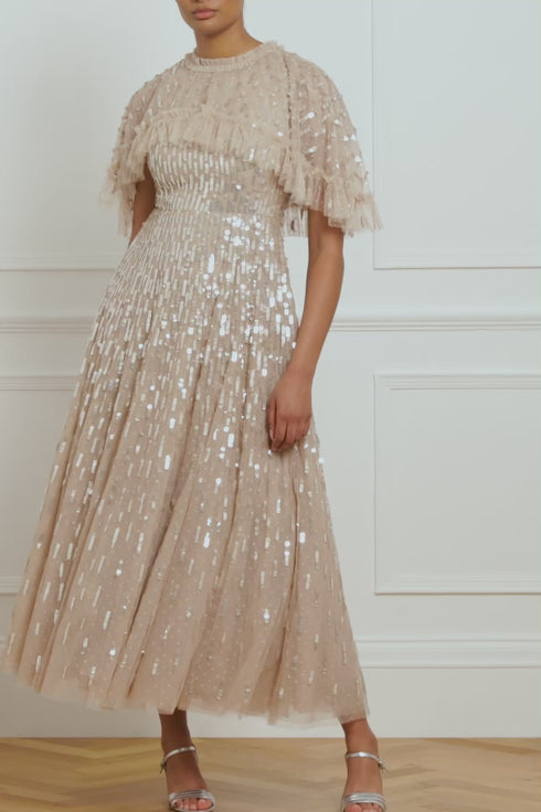 The Sequin Dash Cape Ankle Gown in Sand. This ankle length gown is adorned with statement, square sequins in a staggered linear layout creating a shimmer throughout. Developed with a loose silhouette for an effortless, floaty feel featuring voluminous sleeves for a romantic look. This gown features a layered cape design, which can be removed for versatile styling. The skirt is crafted with layers of net tulle creating movement as you walk. The perfect gown for an upcoming special occasion.