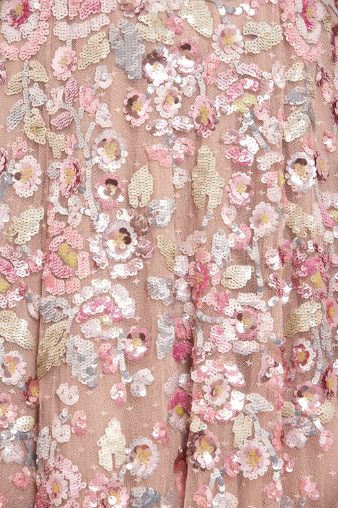 The Sequin Paradise Long Sleeve Gown in Sand. This gown is beautifully embellished with an intricate sequin artwork, inspired by one of our key prints - paradise garden. The sequins are depicted in rich tones of pink and greens creating this enchanting floral artwork. Developed with generous layers of net to create a show-stopping skirt shape. A true Needle & Thread statement piece.