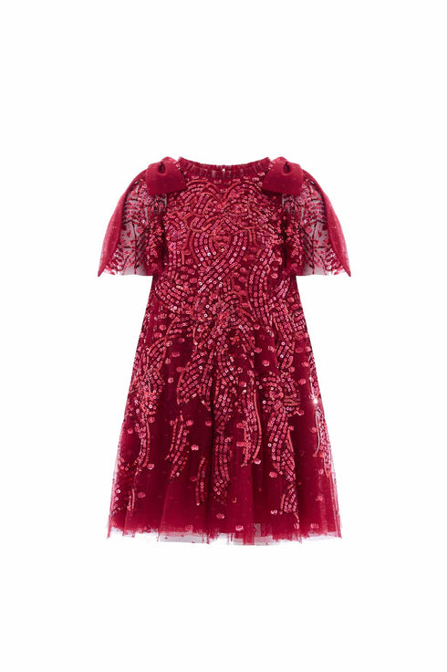 NEW SEASON. The Sequin Ribbon Bow Kids Dress in Red. Crafted in soft layers of tulle, the dress is adorned sequin embroidery that twinkles with movement. A charming bow detail at the neckline adds youthful charm, while the bold red palette makes it perfect for festive celebrations. Pair with the Sequin Ribbon Off-Shoulder Ankle Gown in Red from the womenswear collection for a striking coordinated look.
