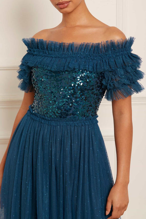 The Sequin Wreath Bodice Off-Shoulder Ankle Gown in Teal. This beautiful gown is crafted with an iconic off-the-shoulder design. Adorned with layers of delicate ruffles, along with an elasticated panel for comfort and hold. The bodice is beautifully decorated with shimmering sequins inspired by a vintage lace curtain. Designed with a romantic layered tulle skirt for signature Needle & Thread styling. A perfect gown for a special occasion.