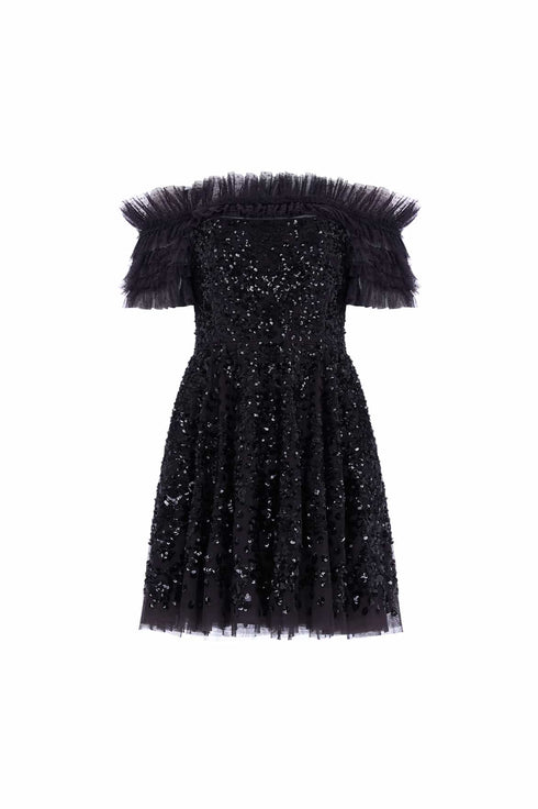 The Sequin Wreath Off-Shoulder Micro Mini Dress in Graphite. This beautiful dress is crafted with an iconic off-the-shoulder design. Adorned with layers of delicate ruffles, along with an elasticated panel for comfort and hold. This dress is beautifully decorated with shimmering sequins inspired by a vintage lace curtain. Developed with an integrated corset for the perfect shape and structure. A truly magical piece.