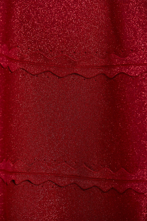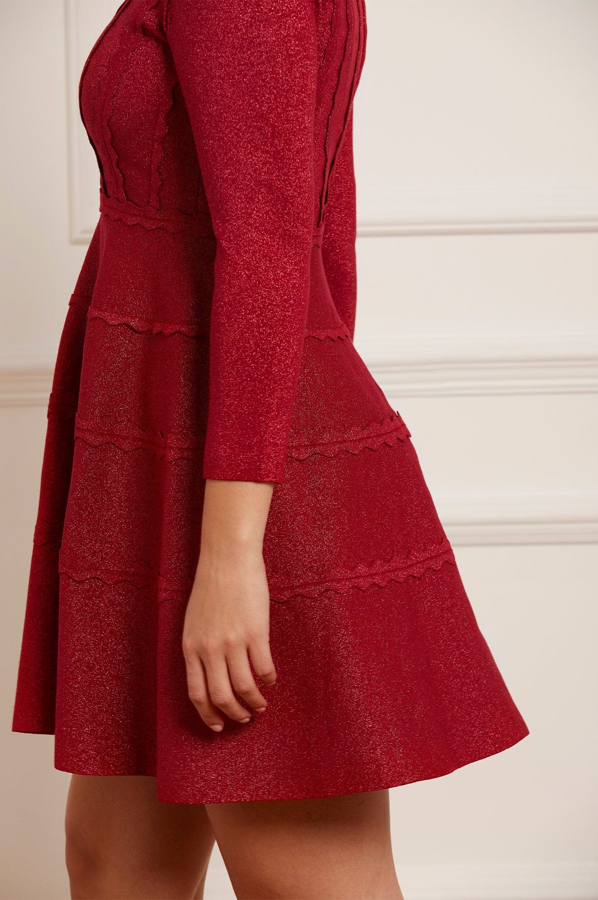 The Shimmer Knit Mini Dress in Deep Red. This mini dress is designed with a shimmer knit fabric inspired by vintage textiles. Crafted intricately with knitted scallop trims for signature Needle & Thread detailing. Developed from a responsibly sourced stretch viscose, twisted with tonal lurex for a delicate subtle shimmer. Designed with a fitted bodice and V-neckline for a flattering silhouette. The perfect dress to take you from day to night.