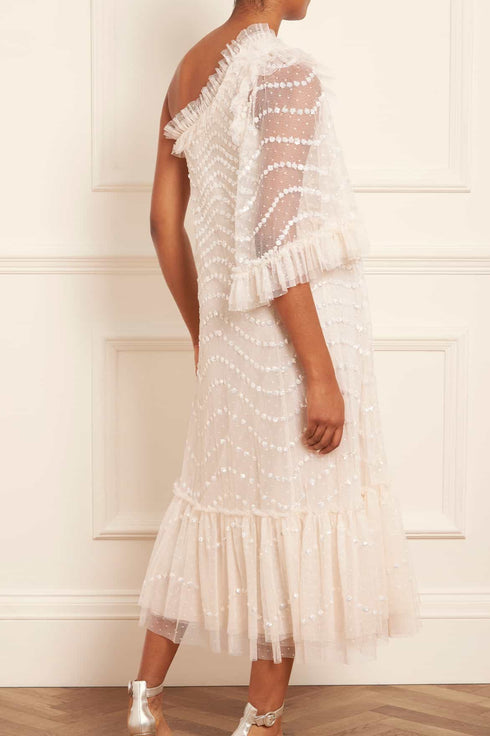 NEW SEASON | NEEDLE & THREAD EXCLUSIVE. The Shimmer Wave Gloss One-Shoulder Ballerina Dress in Cream. This ballerina dress is developed with a one-shoulder design and a generous, voluminous sleeve for elegant detail. Adorned with a shimmering artwork in high gloss sequins. This style is inspired by the sea waves of the Riveria, featuring delicate sequins creating undulating borders for a romantic, glistening effect. The skirt is made up of layers of signature Needle & Thread soft tulle. A Needle & Thread season favourite.