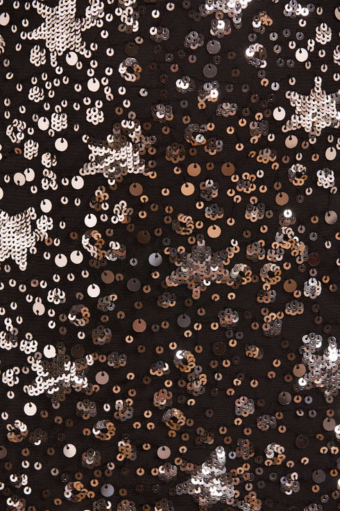 The Shooting Stars Cami Micro Mini Dress in Graphite/Gunmetal. This dress is inspired by the extravagant costumes worn by the Follie’s dancers of the early 1900s. Beautifully decorated with shimmering embellishments of intricate star motifs, with scatters of tiny glittering sequins reminiscent of a night sky. This dress features an elegant, slim silhouette with a playful split adorned with signature Needle & Thread tulle ruffles. This dress captures the magic of fairytales and the beauty of the night sky.