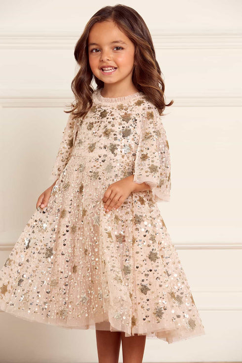 The Shooting Stars KIDS Dress in Dust Beige/Silver. This dress is inspired by the extravagant costumes worn by the Follie’s dancers of the early 1900s. Beautifully decorated with embellishments of intricate star motifs, with clusters of tiny sparkling sequins that scatter towards the hem, creating a shimmering effect. The dress is adorned with signature Needle & Thread tulle ruffles and frills. The skirt features generous layers of net and tulle with a sweeping hemline, perfect for twirling. The loose-fit silhouette ensures easy-to-wear styling. This dress captures the magic of fairytales and the beauty of the night sky.