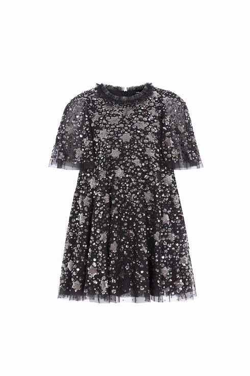 The Shooting Stars KIDS Dress in Dust Graphite/Gunmetal. This dress is inspired by the extravagant costumes worn by the Follie’s dancers of the early 1900s. Beautifully decorated with embellishments of intricate star motifs, with clusters of tiny sparkling sequins that scatter towards the hem, creating a shimmering effect. The dress is adorned with signature Needle & Thread tulle ruffles and frills. The skirt features generous layers of net and tulle with a sweeping hemline, perfect for twirling. The loose-fit silhouette ensures easy-to-wear styling. This dress captures the magic of fairytales and the beauty of the night sky.