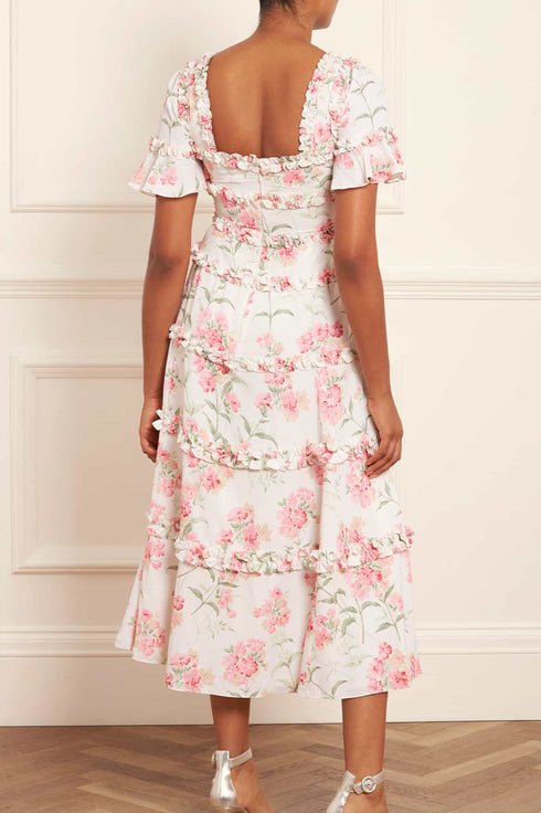 Summer Posy Maya Crepe Ballerina Dress in Moonshine/Coral. A hand-painted archive print featuring sunset and pink peonies in full bloom. This ballerina dress is decorated with pretty posy, floral clusters scattered and dispersed throughout to create an all-over beautiful print. This piece is easy to wear and designed with an effortless silhouette for summer styling. This dress features gently gathered ruffles tiered throughout, adding a romantic all-over texture and signature Needle & Thread detailing. A go-to piece you'll forever treasure.