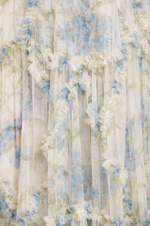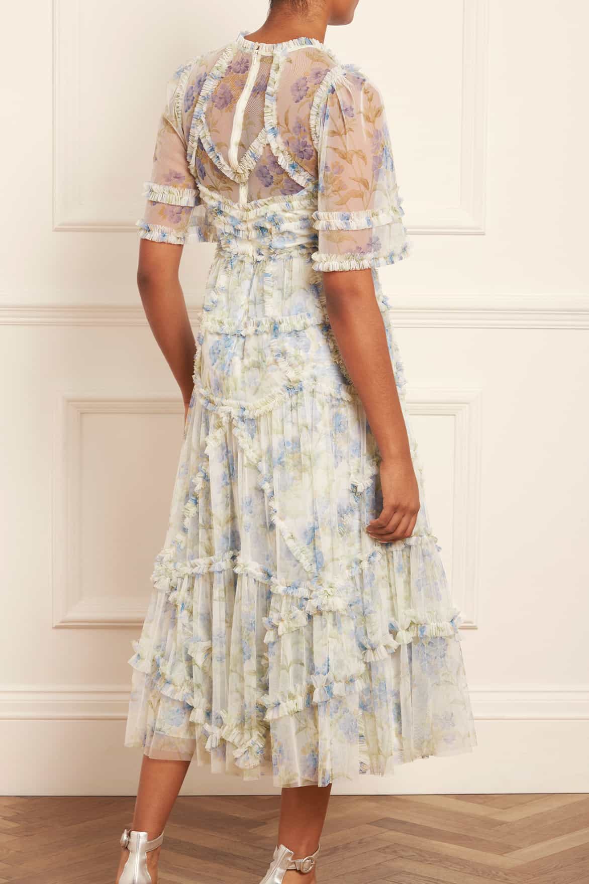 The Summer Posy Short Sleeve Ballerina Dress in Moonshine. The print of this dress is taken from a 1930’s hand-painted wallpaper design. The artwork features a series of powder blue posies scattered in a soft formation. This signature Needle & Thread style is developed with delicate tulle, featuring intricate gathered ruffles engineered to create a flattering textile. Expect all eyes on you in this magical, fun piece.