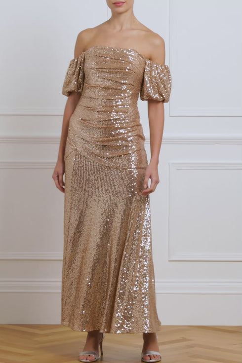 The Sunbeam Valentina Off-Shoulder Gown in Mocha. Turn heads in the dazzling gown. Featuring shimmering 3mm sequins on stretch mesh, an off-shoulder silhouette, and a fluid skirt, this design exudes timeless elegance. Crafted with romantic puff sleeves and soft draping flatter the figure, while an internal corset ensures comfort and support. Perfect for glamorous soirées, this gown promises unforgettable sophistication.