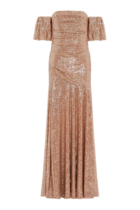 The Sunbeam Valentina Off-Shoulder Gown in Mocha. Turn heads in the dazzling gown. Featuring shimmering 3mm sequins on stretch mesh, an off-shoulder silhouette, and a fluid skirt, this design exudes timeless elegance. Crafted with romantic puff sleeves and soft draping flatter the figure, while an internal corset ensures comfort and support. Perfect for glamorous soirées, this gown promises unforgettable sophistication.