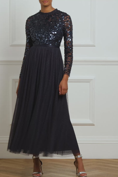 NEEDLE & THREAD EXCLUSIVE. The Tempest Bodice Ankle Gown in Navy. This ankle dress is inspired by a vintage lace tablecloth design, embellished with shimmering sequins all over the bodice. Designed with long sleeves, a layered tulle skirt with an 'x' motif and frill trim detailing around the neck. Make an entrance in the Tempest.