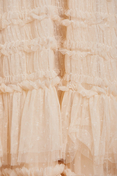 The Valentine Ruffle Gown in Champagne. A signature Needle & Thread style developed with textile ruffles and flattering tulle, creating a romantic look. The ruffles cascade down the dress, starting smaller and gradually getting bigger towards the hem to create soft, fluid movement. Crafted from our signature Needle & Thread kisses tulle. Make a statement in the Valentine.