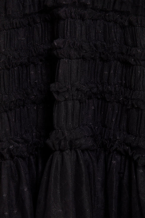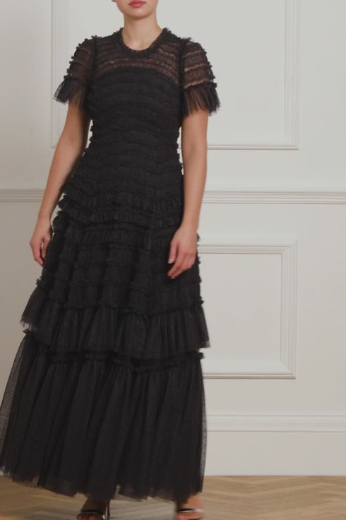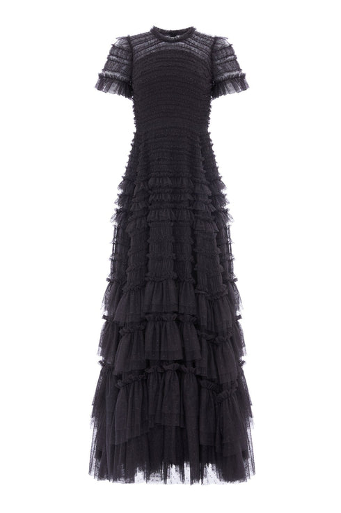 The Valentine Ruffle Gown in Graphite. A signature Needle & Thread style developed with textile ruffles and flattering tulle, creating a romantic look. The ruffles cascade down the dress, starting smaller and gradually getting bigger towards the hem to create soft, fluid movement. Crafted from our signature Needle & Thread kisses tulle. Make a statement in the Valentine.