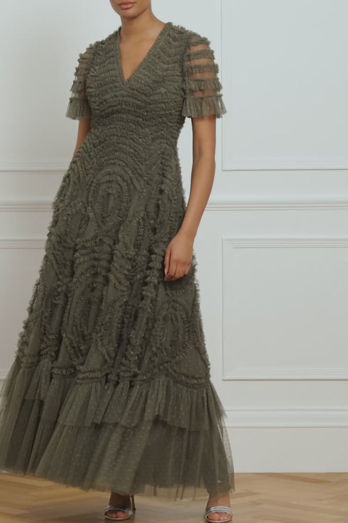 The Verity Ruffle V-Neck Gown in Juniper. A brand new colour for the season ahead. This textile piece is designed with signature Needle & Thread detailing. Beautifully developed with romantic, frothy tulle and delicate ruffles, creating a beautiful artistic effect and flattering shape. Make a statement in the Verity.