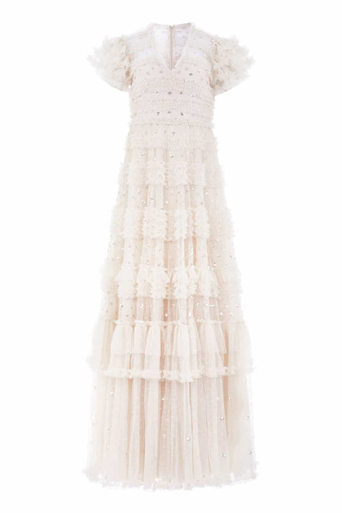 The Vivian V-Neck Gown in Cream. A signature Needle & Thread style statement. Beautifully printed with sequin polka dot motifs scattered throughout, creating an enchanting shimmer. Adorned with specially sourced sequins to create a sparkling effect throughout. This romantic style features tulle frills in perfectly positioned rows, creating a soft, frothy texture. Developed with generous ruffled sleeves and a V-neckline for a contemporary look. A style you'll wear time and time again.