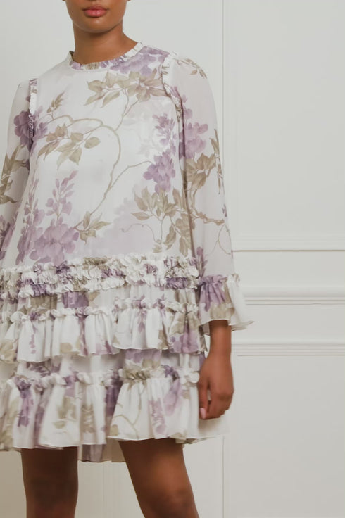 The Wisteria Chiffon Round Neck Mini Dress in Moonshine. This romantic dress is inspired by an early 1900s hand-painted upholstery design. Beautifully printed with large wisteria florals in soft, muted tones, creating a statement design. Developed with a soft chiffon fabric and a loose-fitting silhouette for a floaty look. This dress is engineered with frills at the neckline and hem for a relaxed, signature Needle & Thread design. Make this style your new wardrobe staple.