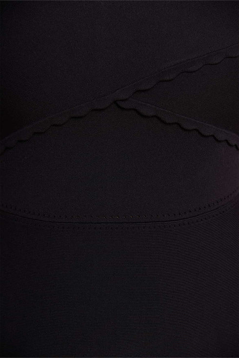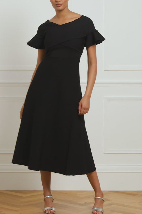 The Wrap Front Knit Gown in Black. This knitted gown is developed using a recycled viscose blend fabric which creates a beautiful, flattering fit. Created with a stretch fitted bodice with a wrap detail featuring signature Needle & Thread scallop trims. This knitted gown is crafted with an open neck, fluted feminine sleeves and Needle & Thread scallop detailing for a signature look. The perfect transitional style.